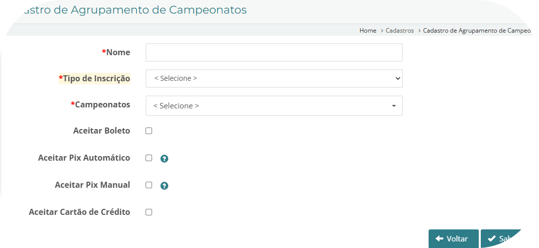 Após preencher todos os campos, clique no botão Salvar para concluir o cadastro do novo agrupamento de competições. Para voltar à página anterior sem salvar, clique em Voltar.