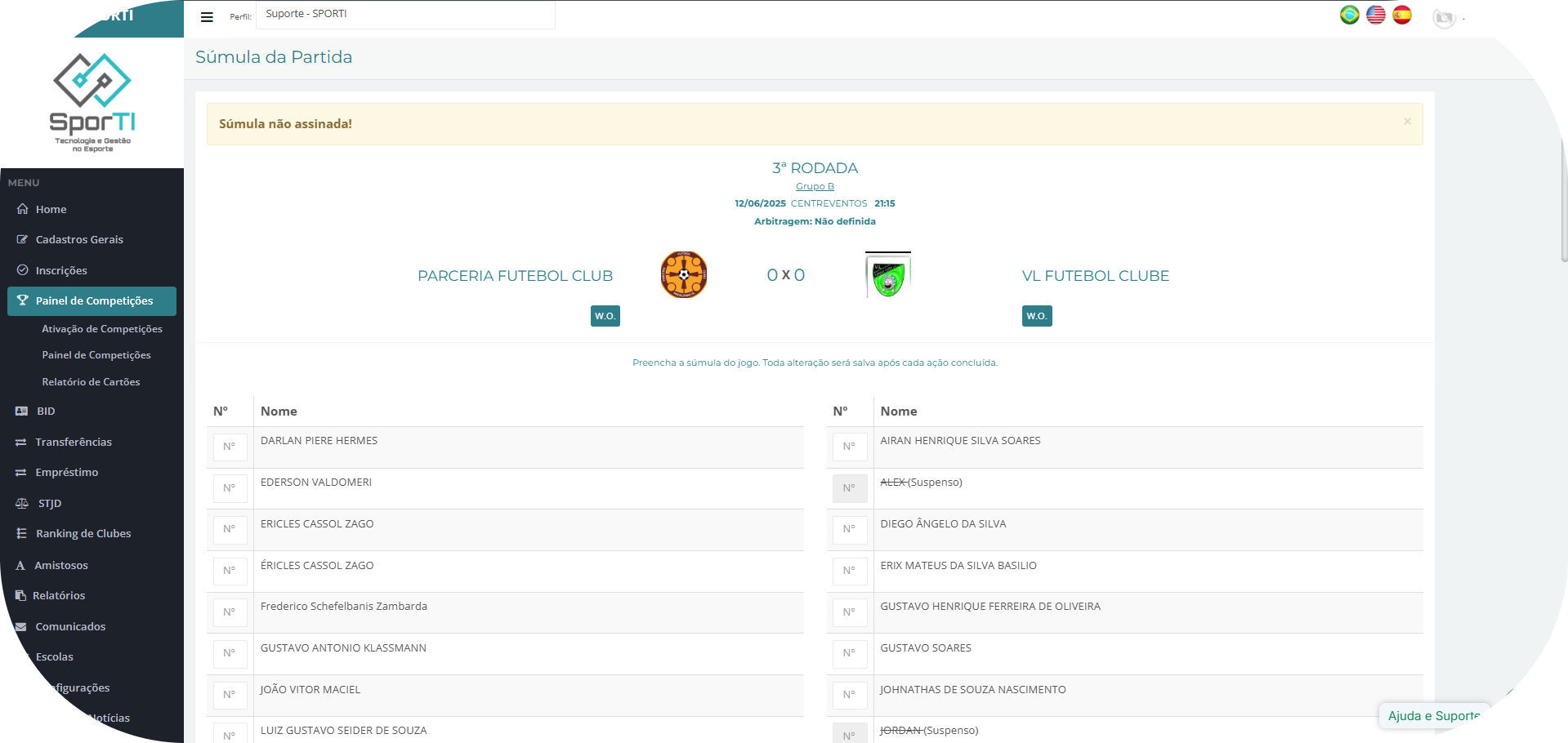 A súmula da partida será registrada com o W.O. aplicado corretamente pelo sistema.