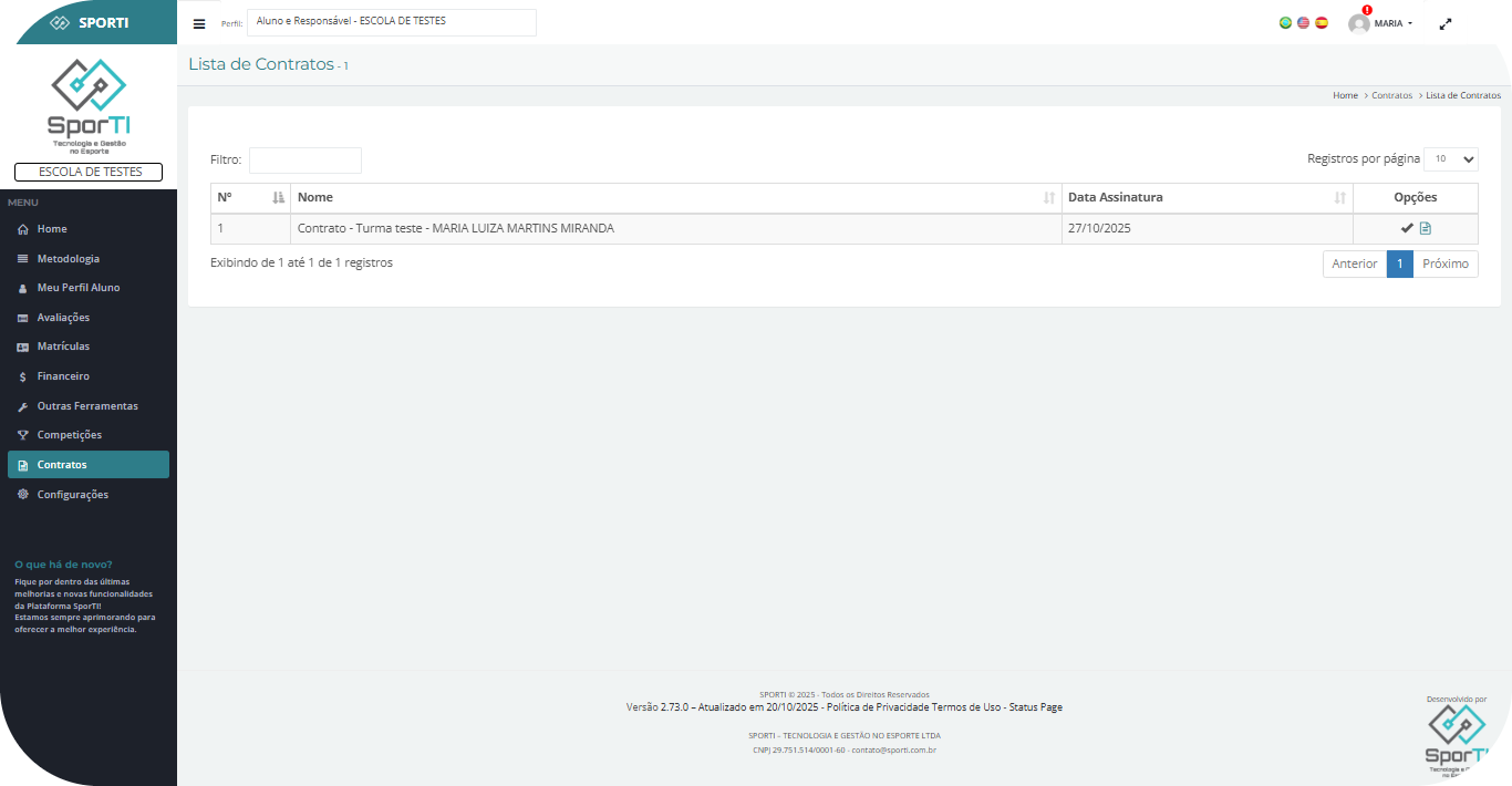 A assinatura deve ser feita pelo aluno ou responsável cadastrado no sistema.