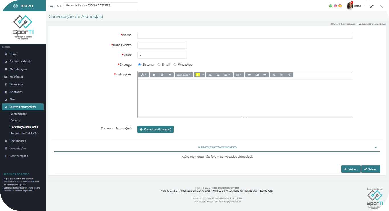 A funcionalidade Convocação de Alunos(as) permite ao gestor criar e enviar comunicados formais aos alunos convocados para participar de jogos, eventos esportivos ou atividades escolares.