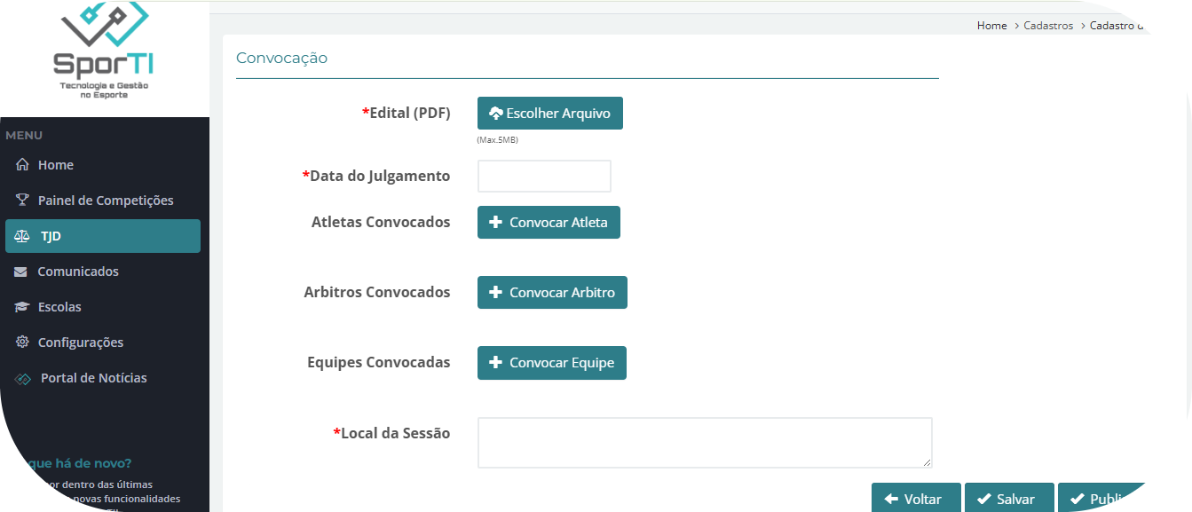 O cadastro de convocações no TJD está disponível apenas para usuários com perfil de Gestor de Liga, Gestor de Competição, Gestor de Organização e TJD dentro da plataforma SporTI.