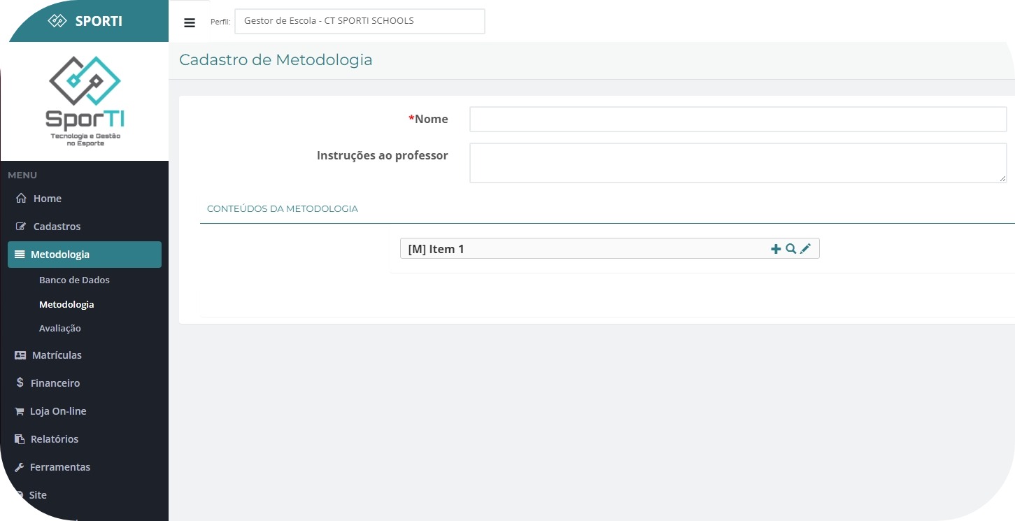 - Nome: Dê um nome claro para sua metodologia (ex: "Futsal Nível Básico", "Tênis para Iniciantes").