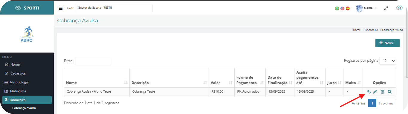 Exemplo: Cobrança Avulsa – Aluno Teste