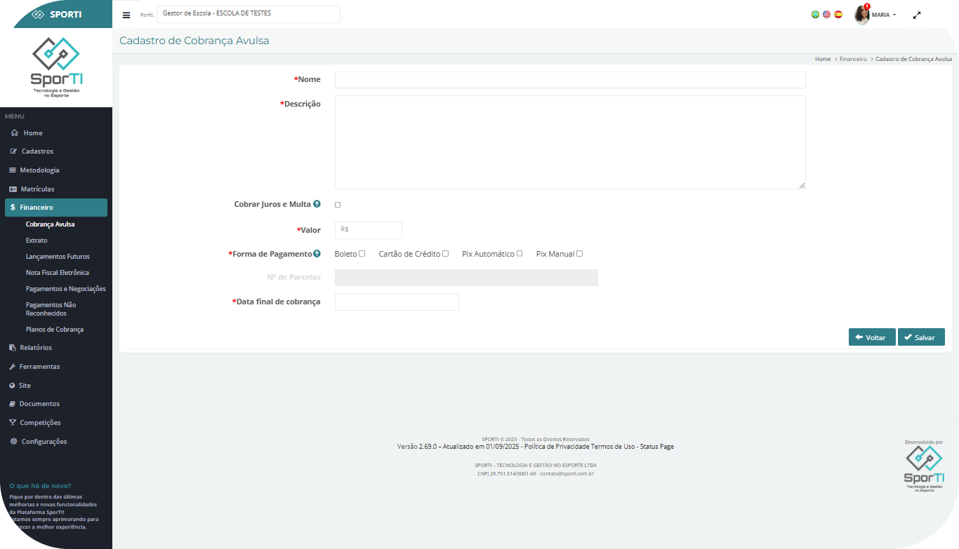 Como criar uma nova cobrança avulsa na plataforma Schools?
