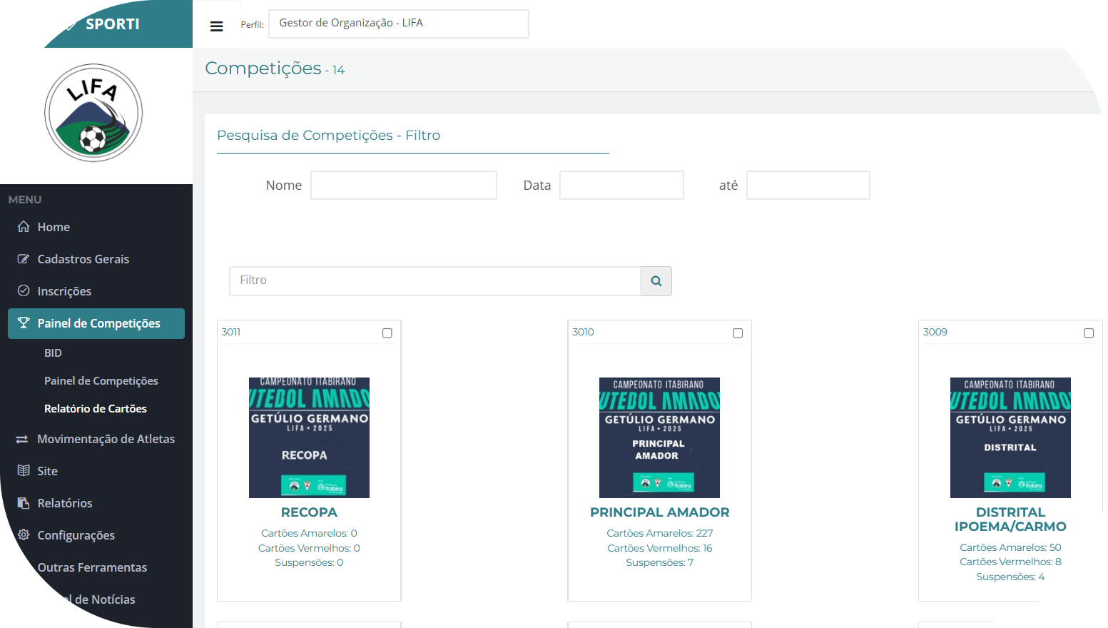 Na tela inicial, serão exibidas todas as competições cadastradas na organização, acompanhadas de informações resumidas — como o total de cartões amarelos, cartões vermelhos e suspensões registrados até o momento.