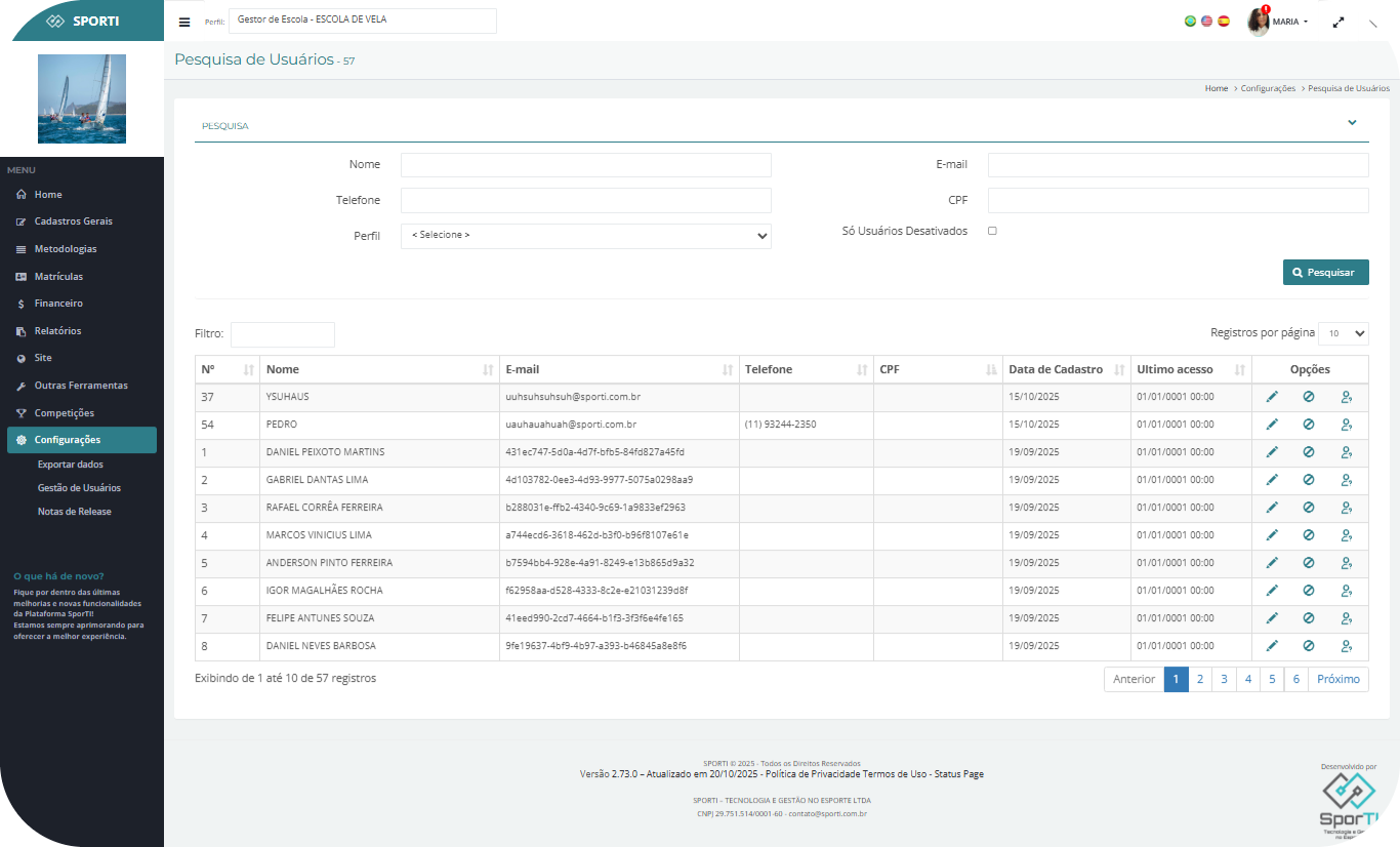Por meio dessa tela, é possível atualizar perfis, desabilitar acessos temporariamente e até realizar a exclusão (anonimização) de cadastros.