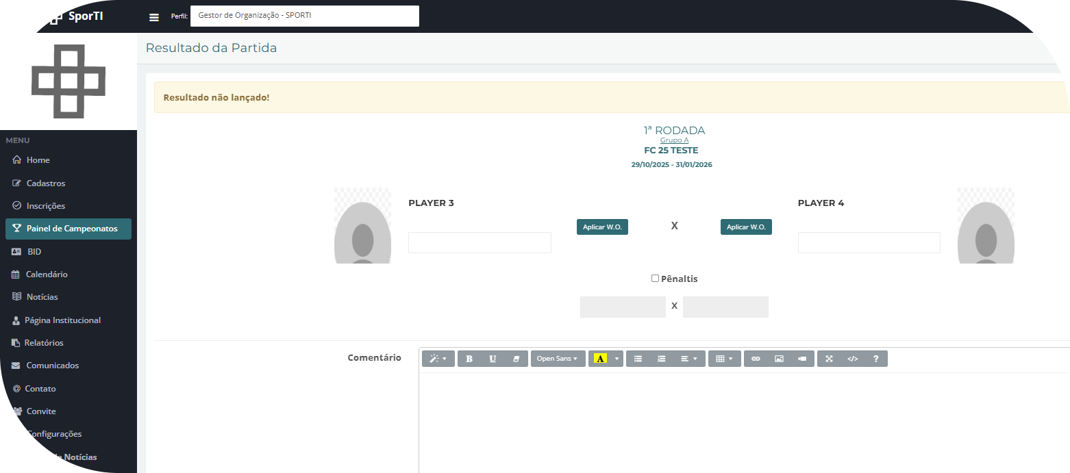 Utilize o campo Comentário para registrar observações relevantes sobre a partida (como desconexões, irregularidades ou destaques).