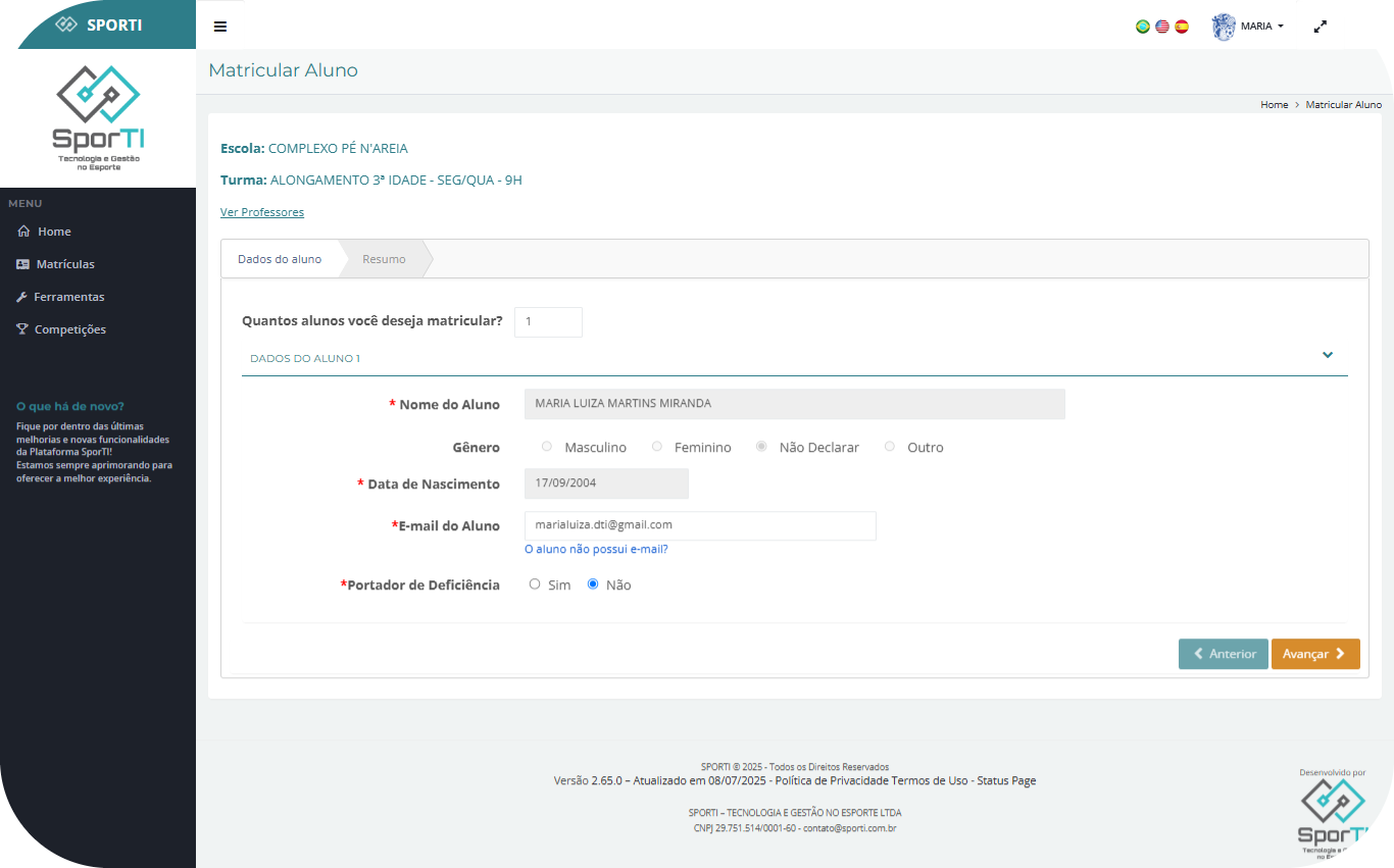 Na tela seguinte, informe quantos alunos deseja matricular e clique em “Avançar”.