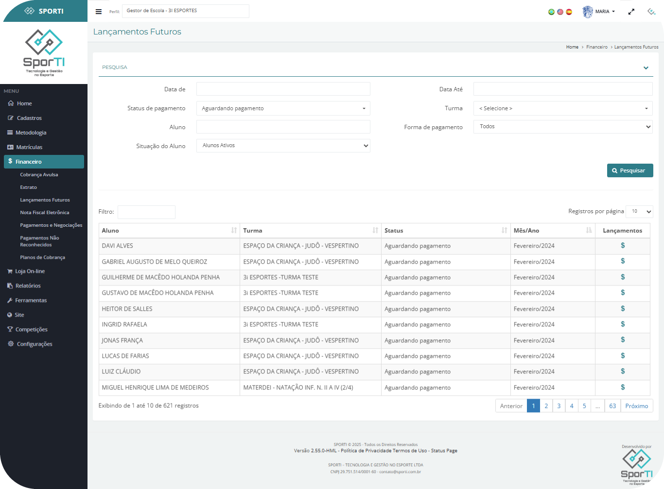 Essa tela centraliza as informações financeiras de alunos, permitindo visualizar rapidamente quais pagamentos estão pendentes, quitados ou aguardando vencimento, facilitando o planejamento financeiro da escola.