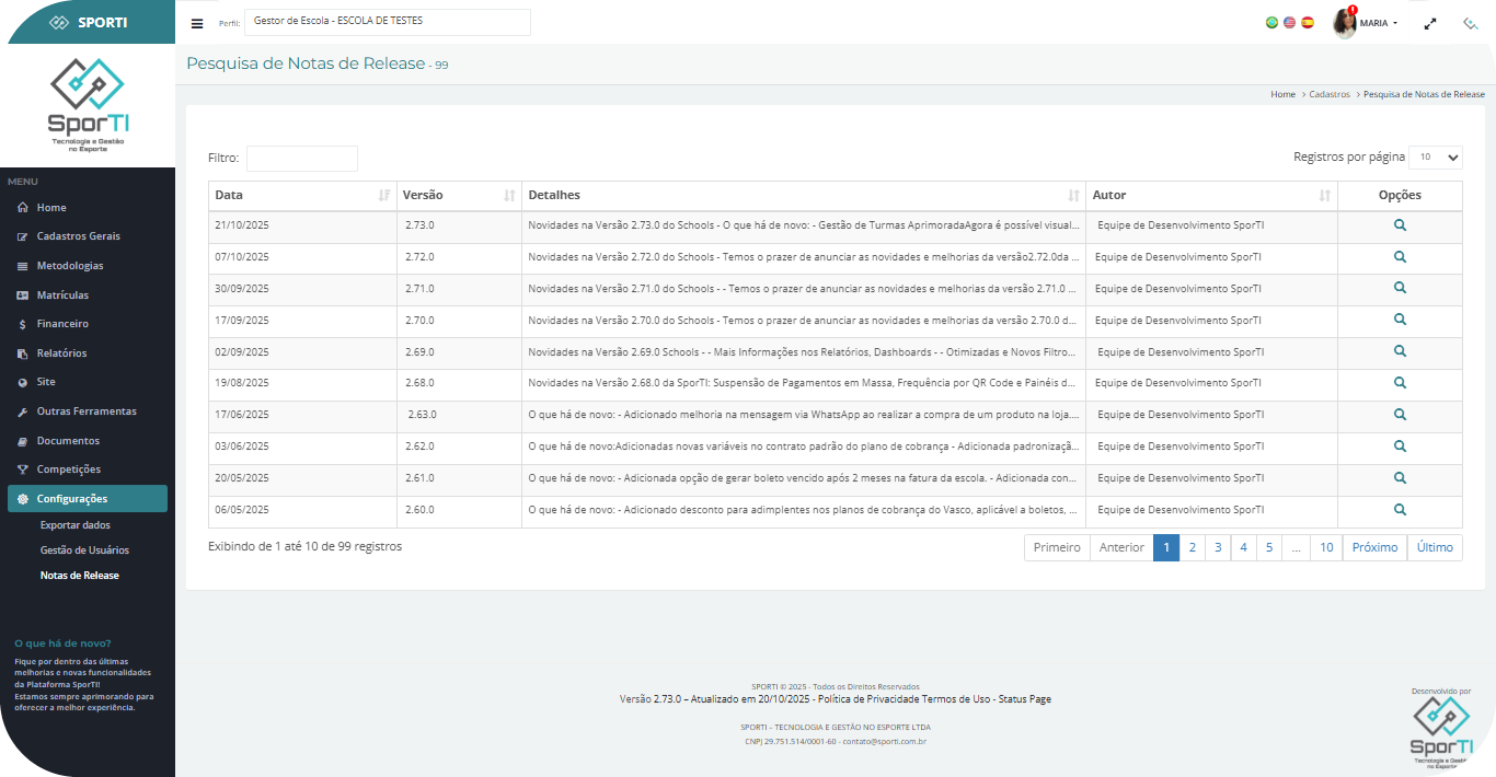 As notas de release da plataforma SporTI Schools apresentam as novidades, melhorias e correções implementadas a cada atualização. Elas são publicadas quinzenalmente e podem ser acessadas por todos os usuários diretamente pelo sistema.