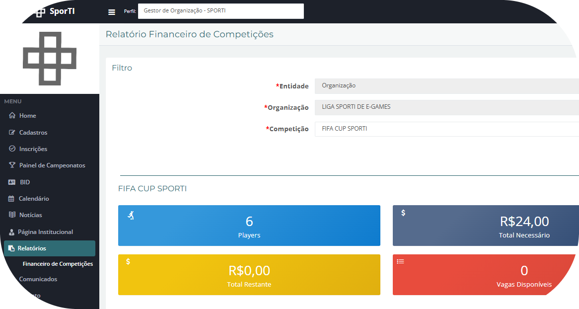 Abaixo, o sistema exibirá as informações financeiras da competição selecionada, incluindo: