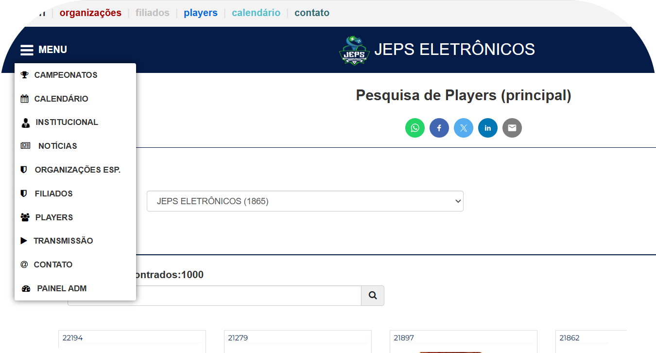 No campo Organização, selecione a entidade ou liga à qual deseja consultar os jogadores (exemplo: JEPS ELETRÔNICOS).