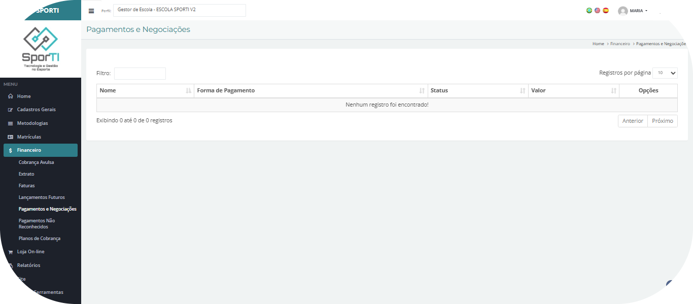 A funcionalidade “Pagamentos e Negociações" tem como objetivo permitir que o Gestor de Escola visualize e gerencie as cobranças avulsas enviadas pela Rede, possibilitando o acompanhamento e pagamento diretamente pela plataforma SporTI Schools.